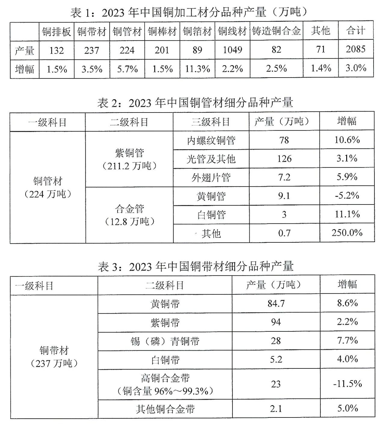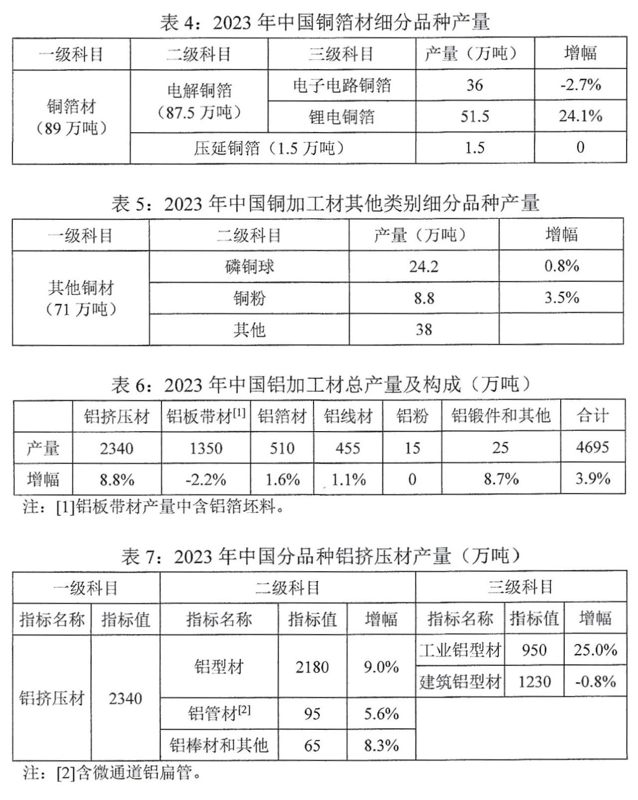 2023年,中國銅加工材綜合產(chǎn)量為2085萬噸,比上年增長3.0%。鋁加工材綜合產(chǎn)量為4695萬噸,比上年增長3.9%,其中剔除鋁箔坯料后的鋁加工材產(chǎn)量為4115萬噸,比上年增長4.2%。銅鋁加工材細分品種產(chǎn)量和鋁擠壓材表面處理方式構成詳見下表1至表11。